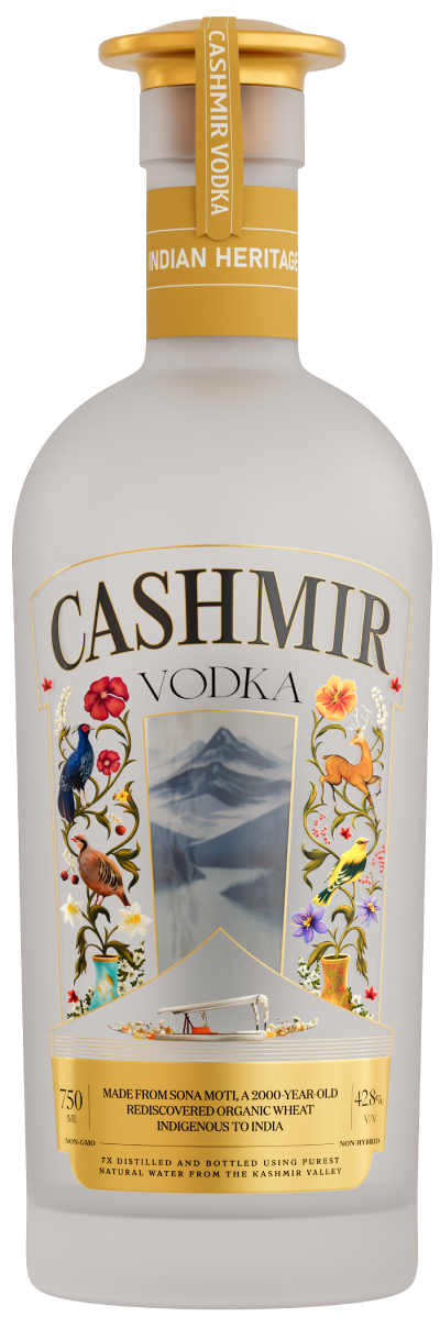 Cashmir Vodka is a premium small-batch vodka crafted from Sona Moti, a rare, 2000-year-old rediscovered, non-GMO, non-hybrid organic heritage wheat from the Punjab region. Known as 'Golden Pearl’ for its vibrant golden grains and deep-rooted significance in Indian culinary heritage, this sustainably farmed grain imparts exceptional purity and depth of character. A true tribute to tradition and craftsmanship.