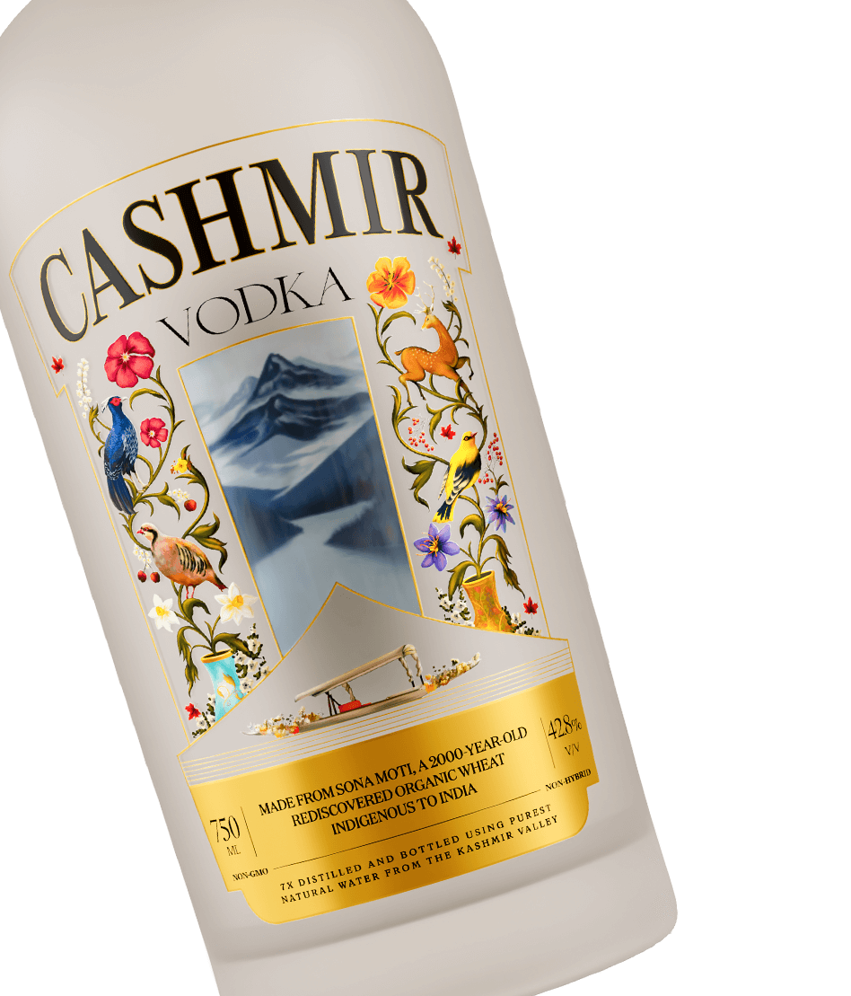 Cashmir Vodka is a premium small-batch vodka crafted from Sona Moti, a rare, 2000-year-old rediscovered, non-GMO, non-hybrid organic heritage wheat from the Punjab region. Known as 'Golden Pearl’ for its vibrant golden grains and deep-rooted significance in Indian culinary heritage, this sustainably farmed grain imparts exceptional purity and depth of character. A true tribute to tradition and craftsmanship.